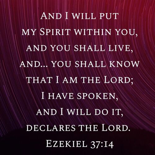 Then he said to me, “Son of man, these bones are the whole house of Israel. Behold, they say, ‘Our bones are dried up, and our hope is lost; we are indeed cut off.’ Therefore prophesy, and say to them, Thus says the Lord God: Behold, I will open your graves and raise you from your graves, O my people. And I will bring you into the land of Israel. And you shall know that I am the Lord, when I open your graves, and raise you from your graves, O my people. And I will put my Spirit within you, and you shall live, and I will place you in your own land. Then you shall know that I am the Lord; I have spoken, and I will do it, declares the Lord.”