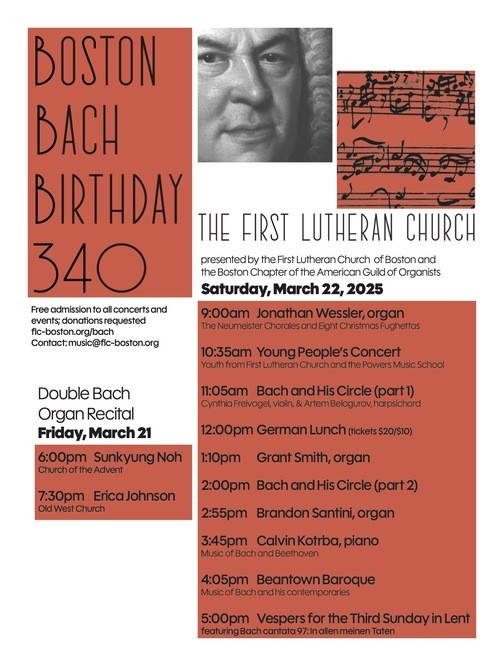 Every year since 2009, on the Saturday nearest his birthday, First Lutheran Church has presented the Boston Bach Birthday, a day-long celebration of the Johann Sebastian Bach and his music. The experience is filled with solo and chamber performances by organists, instrumentalists, and singers, and FLC's world-class pipe organ figures prominently. The day features a delicious German lunch (tickets $20 at the door) and a Vespers service with Bach cantata. Admission is free to all musical events. While some stay for the whole day, and others attend but one or two events, all leave having been musically and spiritually edified.